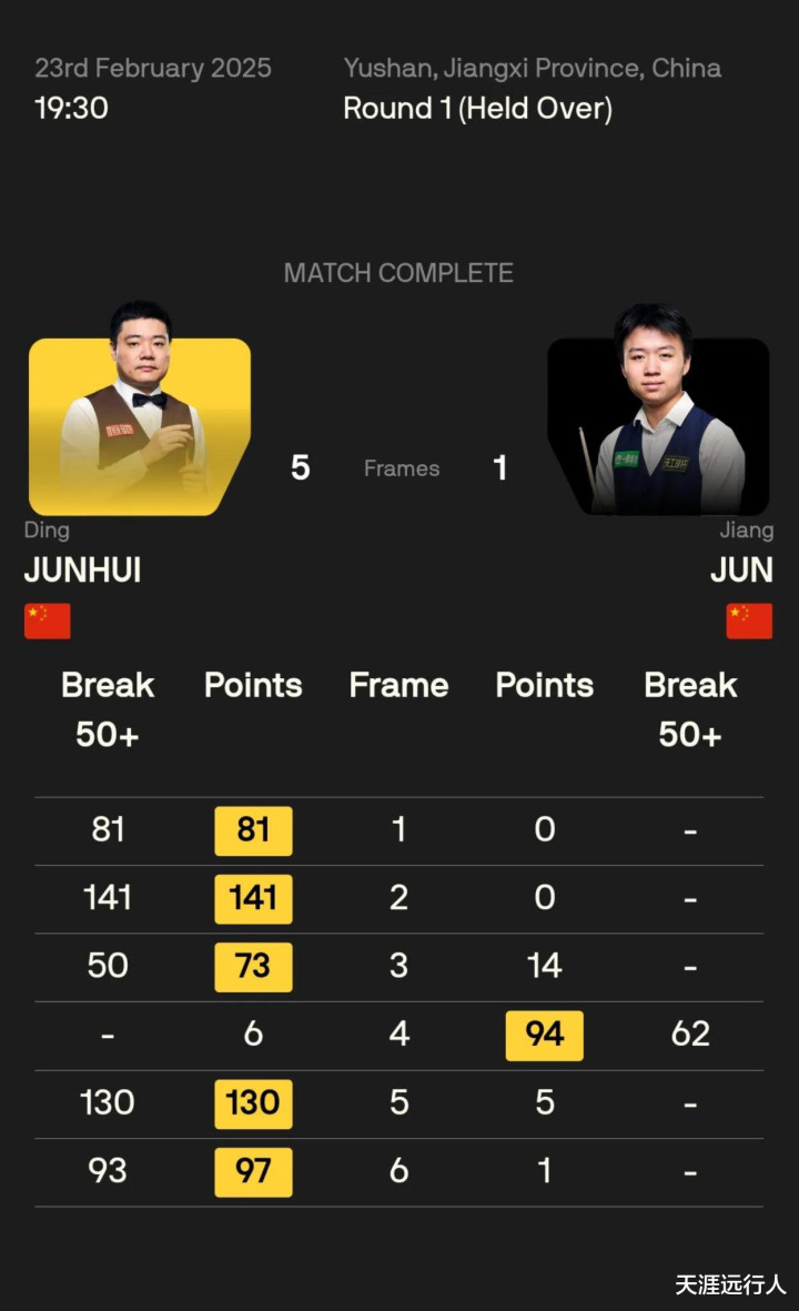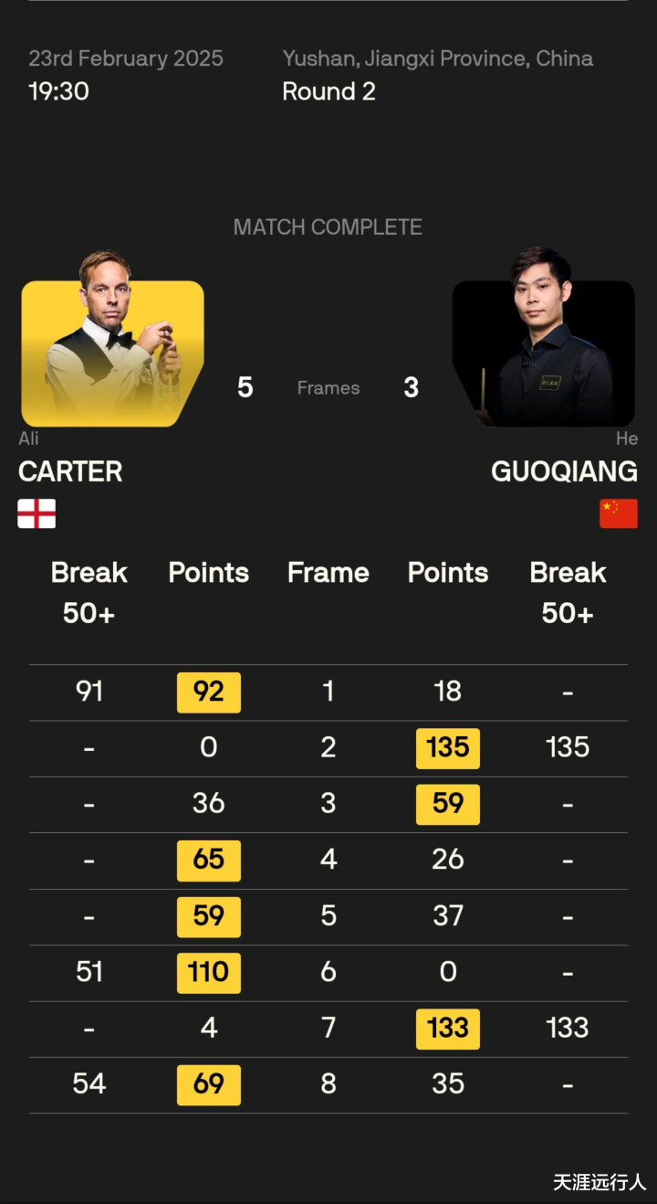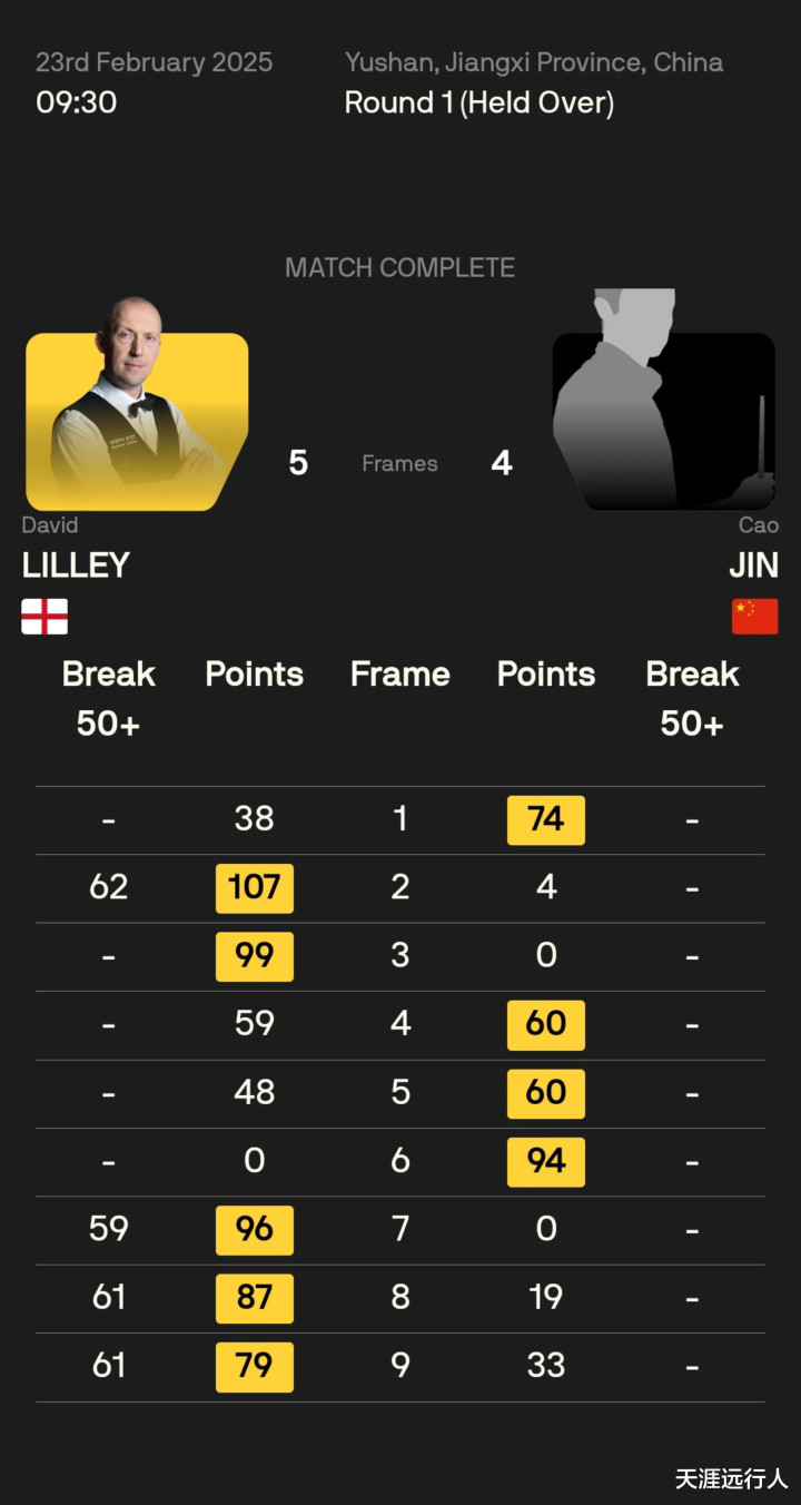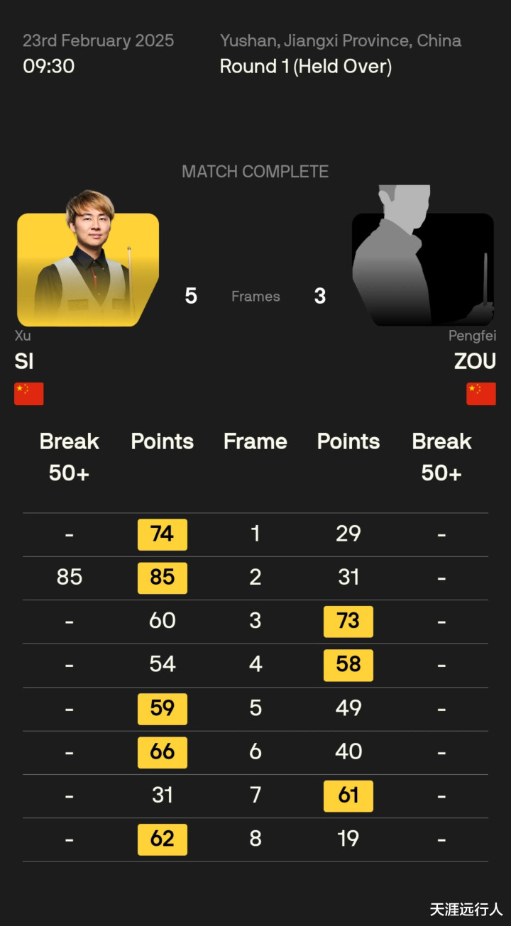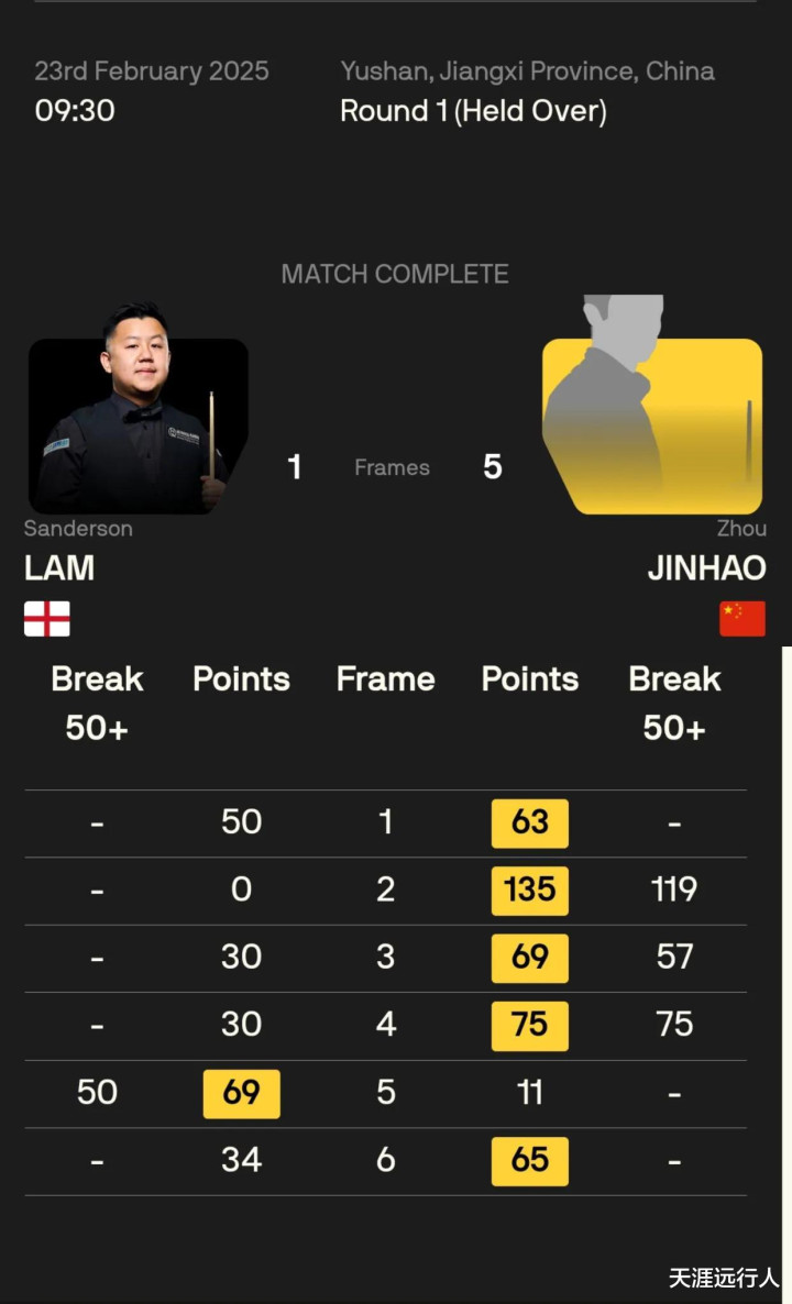 另有五位中国球员出战正赛64进32轮次前半程的比赛,刘宏宇爆冷拿下塞尔比,吴宜泽险胜杰克逊·佩奇,周跃龙轻取泰国佩马莱克,吕昊天、国强倒在正赛首轮。