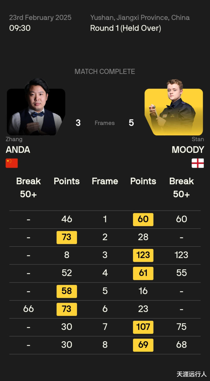 双方职业生涯曾有过三次交手,张安达两胜一负领先,本场比赛慢热的张安达仅仅打出一杆单杆50+,而18岁的英格兰小将斯坦·穆迪则是手感火热,轰出一杆破百和四杆单杆50+,先后以1-0、3-1领先,被达仔追平后,连下两城,锁定胜利,张安达继上海大师赛输给16岁的周金豪之后,再次在大陆举办的职业赛尴尬一轮游。
