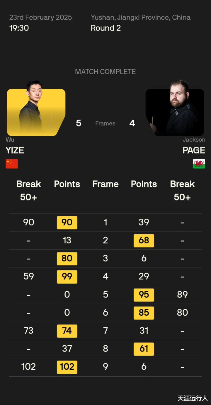 吴宜泽全场打出一杆102分破百和90、59、73分三杆单杆50+,杰克逊·佩奇打出89、80分两杆单杆50+,双方鏖战至决胜局,决胜局中吴宜泽打出单杆102分锁定胜局,以5-4力克佩奇,晋级32强。