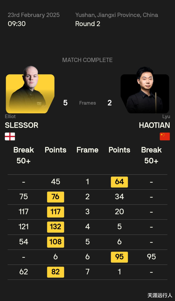 本场开杆,吕昊天先拔头筹,斯莱塞连打两杆破百和两杆单杆50+,一波四连鞭,来到赛点,吕昊天勉力打出单杆95分,错过了一杆简单的破百,追回一分,斯莱塞再打单杆62超分,拿下比赛。
