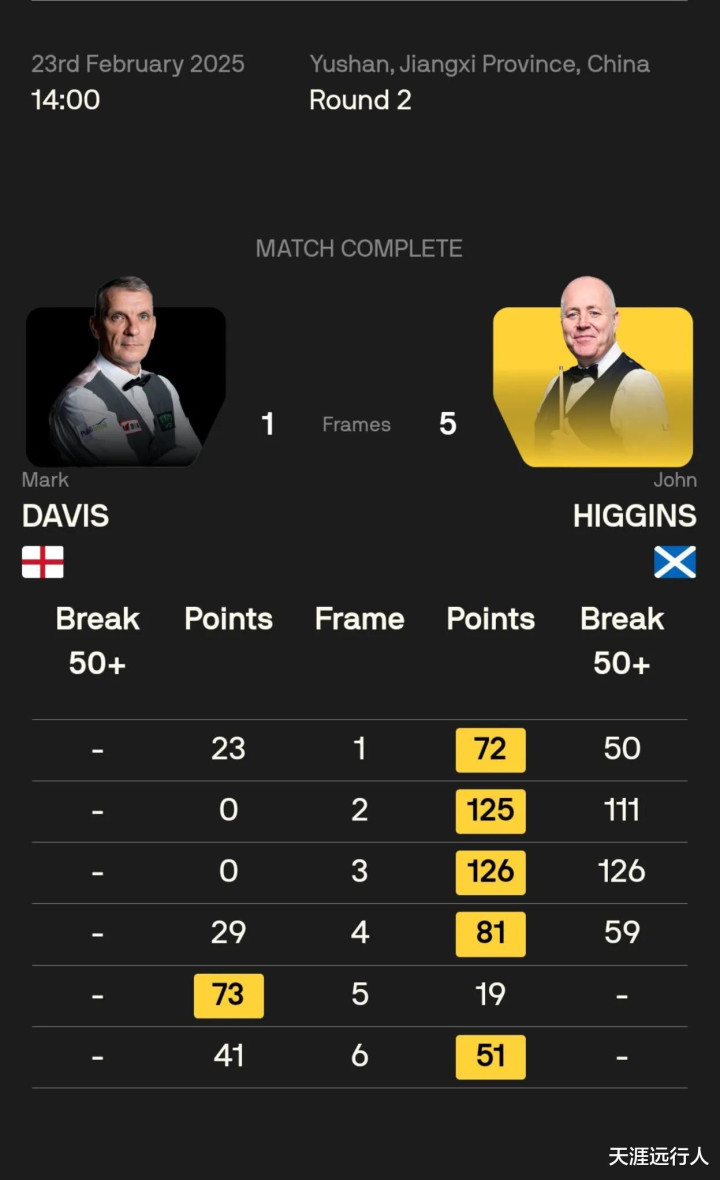 希金斯开杆连打两杆破百、两杆单杆50+,一波四连鞭拿到赛点,马克·戴维斯拼力扳回一城,致胜局陷入胶着的缠斗,希金斯51-41,完成超分获胜,挺进32强。
