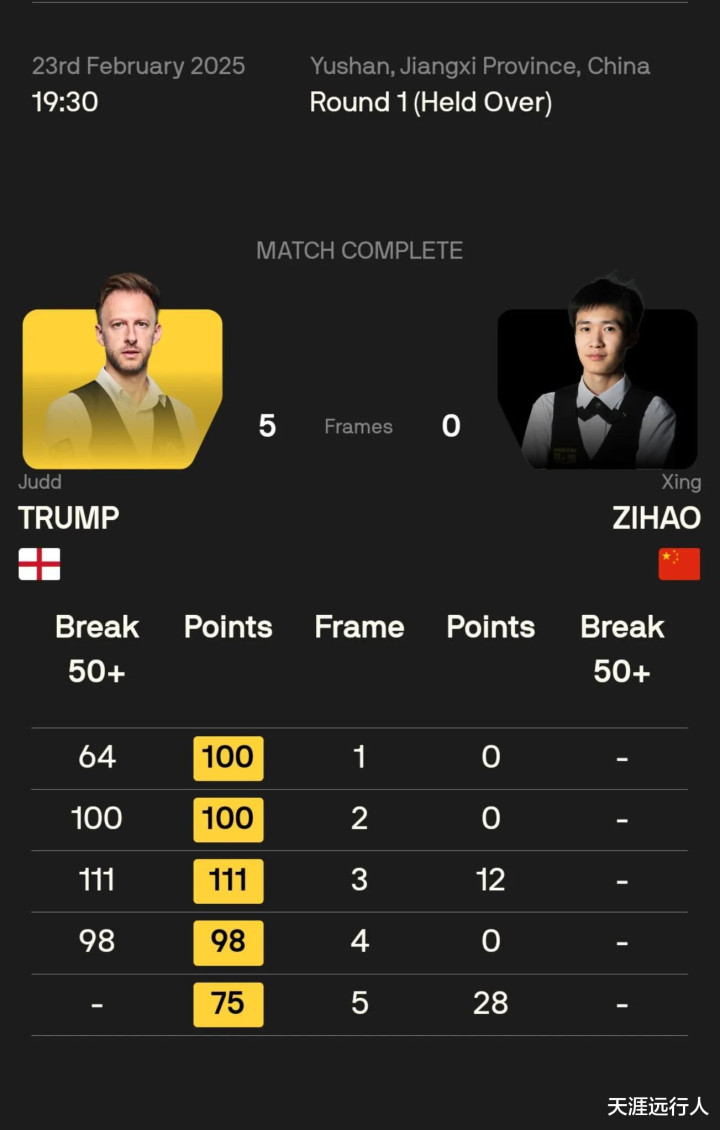 贾德·特鲁姆普全场打出100、111分两杆破百和64、98分两杆单杆50+,连胜五局以5-0战胜邢子豪,五局中有三局零封,小特晋级64强,下一轮将对阵另一位中国球员龙泽煌。