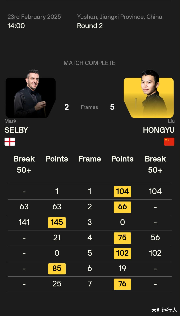 这是双方职业生涯的第三次遭遇,2019年海宁公开赛15岁的刘宏宇1-4落败,20天前的德国大师赛正赛首轮,塞尔比5-2达成两连胜。本场比赛开杆,刘宏宇首局打出单杆103分破百先拔头筹,第二局马克·塞尔比打出63分的情况下,刘宏宇完成清台、3分逆转单局,第三局塞尔比飚出单杆141高分,扳回一局,紧接着刘宏宇接连打出单杆102、56分,拿到赛点,塞尔比第六局拼力挽救一个赛点,制胜局的攻防转换中,刘宏宇翻进红球上手,完成超分锁定胜利,以5-2力压本赛季已夺三冠的塞尔比,强势晋级32强。
