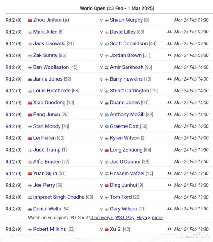 斯诺克世界公开赛正赛首轮64进32轮次后半程赛程+观战指南