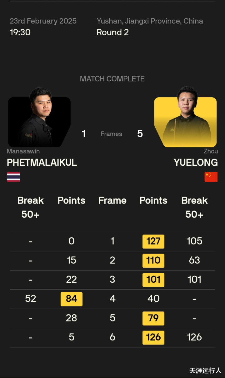 这是双方的首次遭遇,周跃龙打出126、105、101分三杆单杆破百和一杆单杆63分,以5-1力克泰国球员玛纳萨文·佩玛莱克,晋级32强。